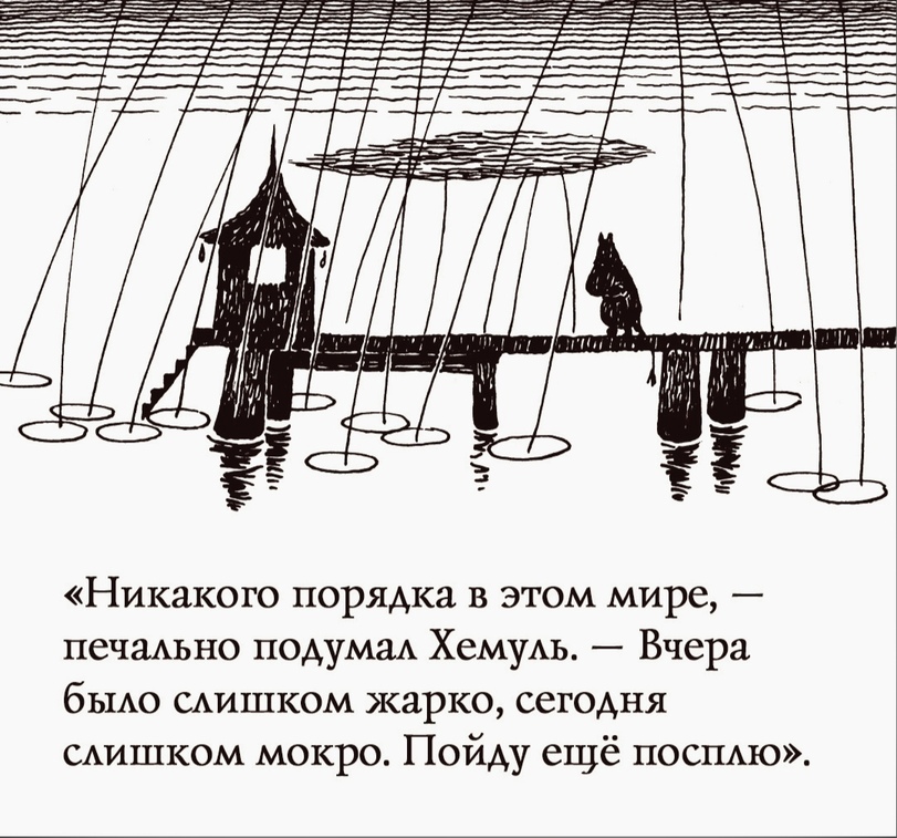 Был конец июля, в Муми-доле стояла страшная жара. Даже мухи и те не находили силы жужжать. Изнемогали запыленные деревья, обмелела речка. Она теперь еле струилась узеньким серым ручейком по жаждущим лугам, и из ее воды уже не получалось вкусного фруктового сока в шляпе Волшебника (которая была помилована и стояла под зеркалом на комоде).